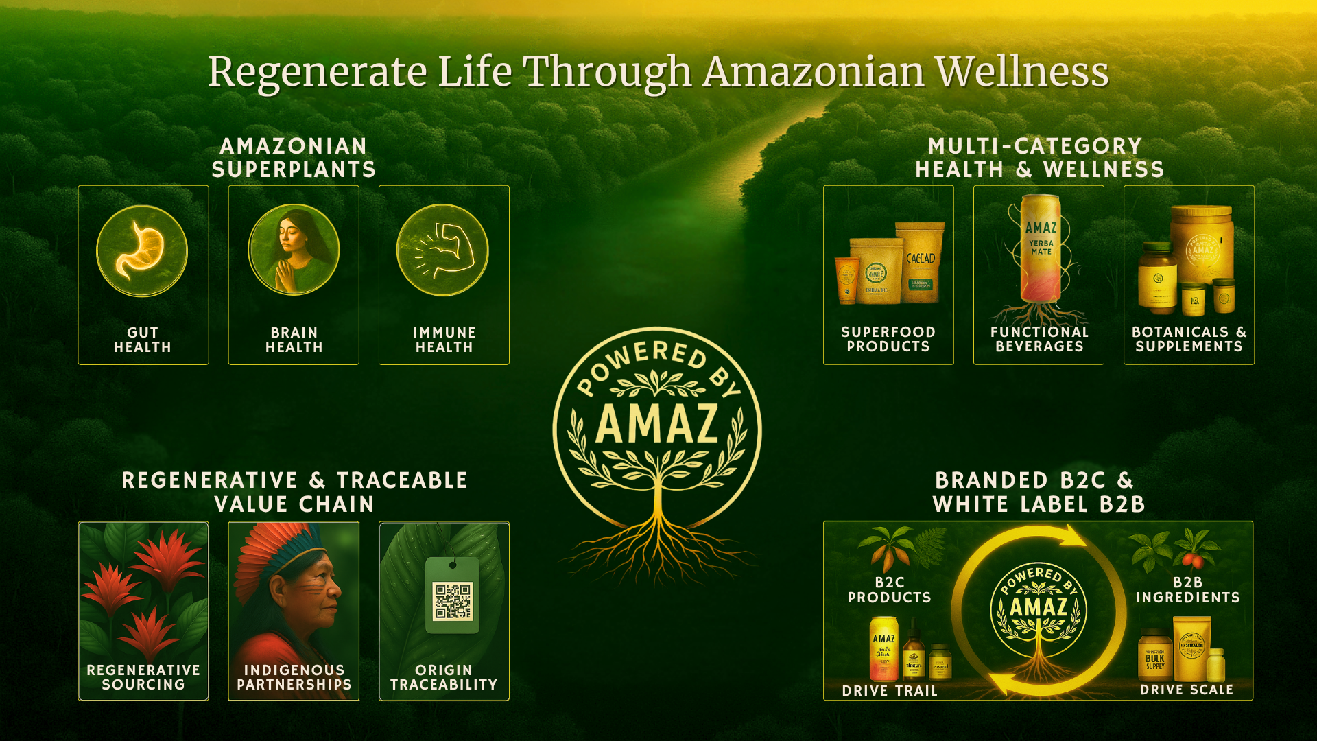 A regenerative wellness brand powered by Amazonian superplants. From functional beverages to next-gen supplements, AMAZ blends modern wellness with ancient rainforest intelligence — supporting forest-dweller communities and protecting standing forest.
